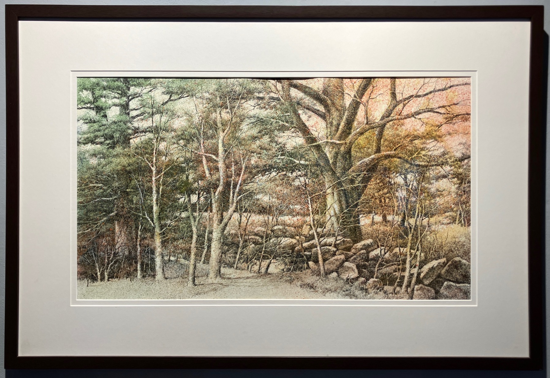Discount $ 2,200. Sold ! Whispering Pines 26.5” x 32.5” framed pen, ink, & acrylic on paper